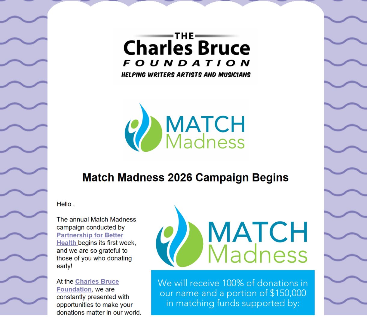 Charles Bruce Foundation Newsletter Archives April 2026 Match Madness Final Update Match Madness Update #3 Match Madness Update #2 Match Madness Update #1 February 2026 January 2026 December 2025 November 2025 October 2025 September 2025 August 2025 July 2025 June 2025 May 2025 April 2025 Match Madness Final Update Match Madness Update #4 Match Madness Update #3 Match Madness Update #2 Match Madness Update #1 Match Madness Launch February 2025 January 2025 December 2024 November 2024 October 2024 September 2024 August 2024 July 2024 June 2024 May 2024 April 2024 Match Madness Countdown #4 Match Madness Countdown #3 Match Madness Countdown #2 Match Madness Countdown #1 Match Madness Update #2 March 2024 Match Madness Update #1 Match Madness Launch 2024 February 2024 January 2024 December 2023 November 2023 October 2023 September 2023 August 2023 July 2023 June 2023 June 2023 Special Edition May 2023 April 2023 Match Madness Update #4 Match Madness Update #3 Match Madness Update #2 April 2023 Match Madness Update #4 Match Madness Update #3 Match Madness Update #2 Match Madness Update #1 February 2023 Match Madness Launch 2023 January 2023 December 2022 November 2022 October 2022 September 2022 August 2022 July 2022 June 2022 May 2022 April 2022 March 2022 MM Update #4 2022 MM Update #3 2022 MM Update #2 2022 MM Update #1 2022 April 2022 March 2022 February 2022 January 2022 December 2021 October 2021 September 2021 August 2021 July 2021 June 2021 May 2021 April 2021